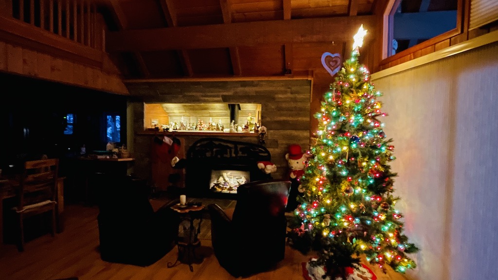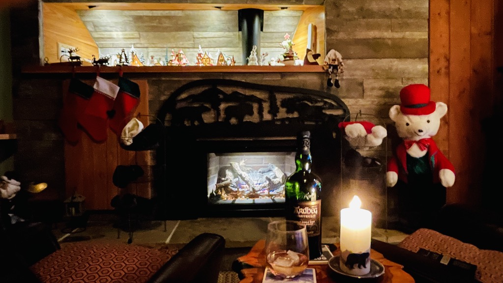 Christmas lights on a tree, a village on the mantle, and "Secret Bear" keeping watch on the hearth by a warm fire in cozy surroundings.