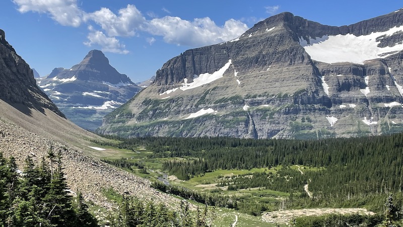 */After the creek the trail goes uphill before entering the scree switchbacks. This is the view looking back where we had come from. Down below is Preston Park. On the upper right is Piegan Glacier. The pointy peak at the left is Mt. Reynolds at Logan Pass. It's impossible to capture in photos the immense peripheral view from the trail from all directions. It was near this point the stranger on the trail gave us the day's adjective of stupendous. /*