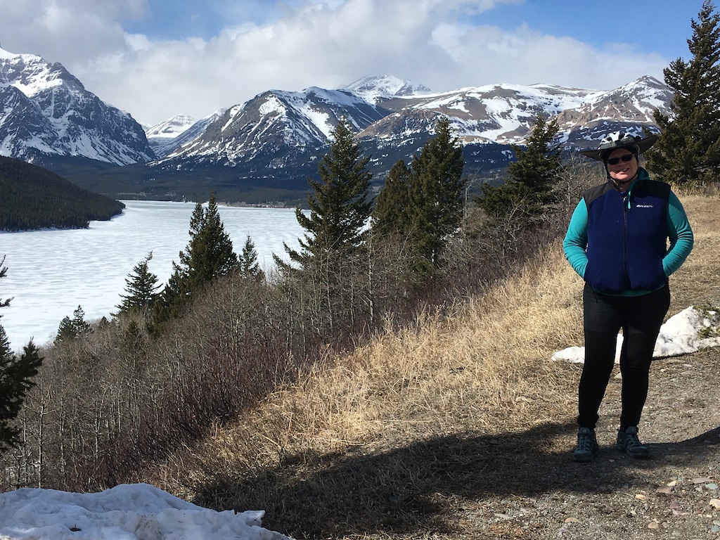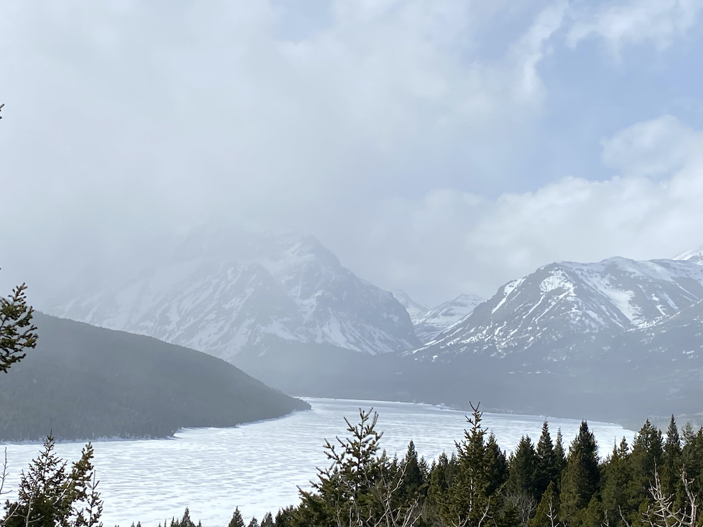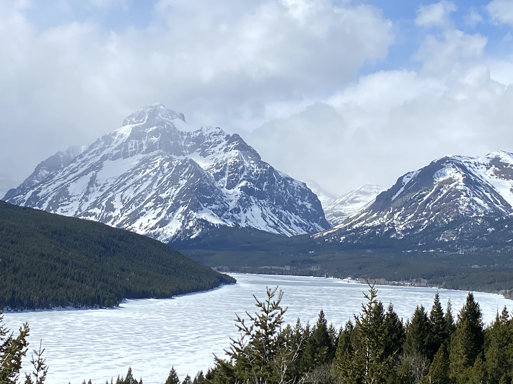 This is our view as we bike up. Lower Two Med Lake is frozen solid. Scenic Point to the left, and Sinopah Mountain https://en.wikipedia.org/wiki/Sinopah_Mountain is in the middle. Big Sky country. You should really see what it looks like in person!
