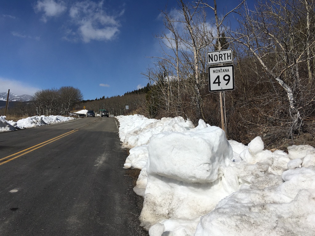 Montana Hwy 49. Looking Glass Highway. The winter closure is just after the Two Medicine turn off. In the photo there are two cars parked next to the barricades. Blue sky with the ever present east side breeze, maybe about 40 degrees.