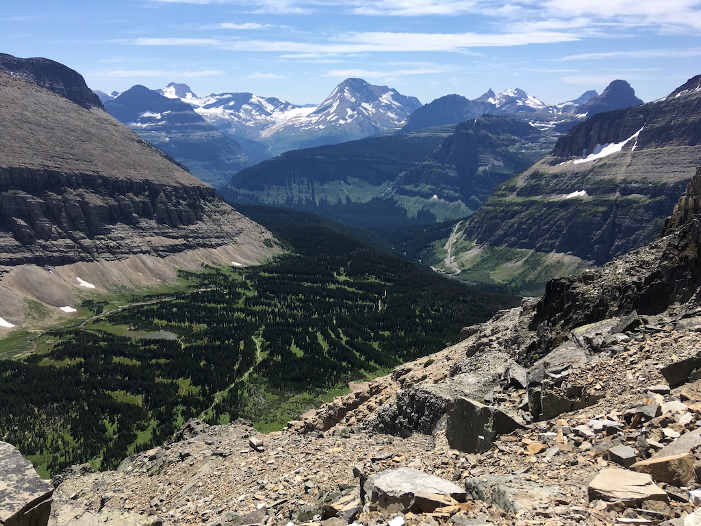 July 29, 2019 Mt. Siyeh. Hiking with three age 30-something alpha males, I was humbled enough to admit that they should go on without me. They did successfully make it to the summit. There is no official trail, and the route we ended up on was definitely not the easiest route described in the climbing book. But the weather and views that I experienced were still amazing. My view of Preston Park on a very clear day, with 4 glaciers beyond was excellent.