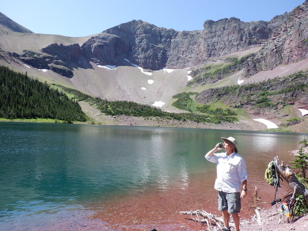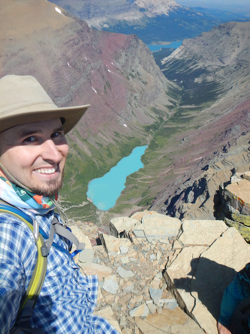 Mo on top of Mt. Siyeh, with Cracker Lake 4000 feet below him!!! Lake Sherburne is off in the distance.
