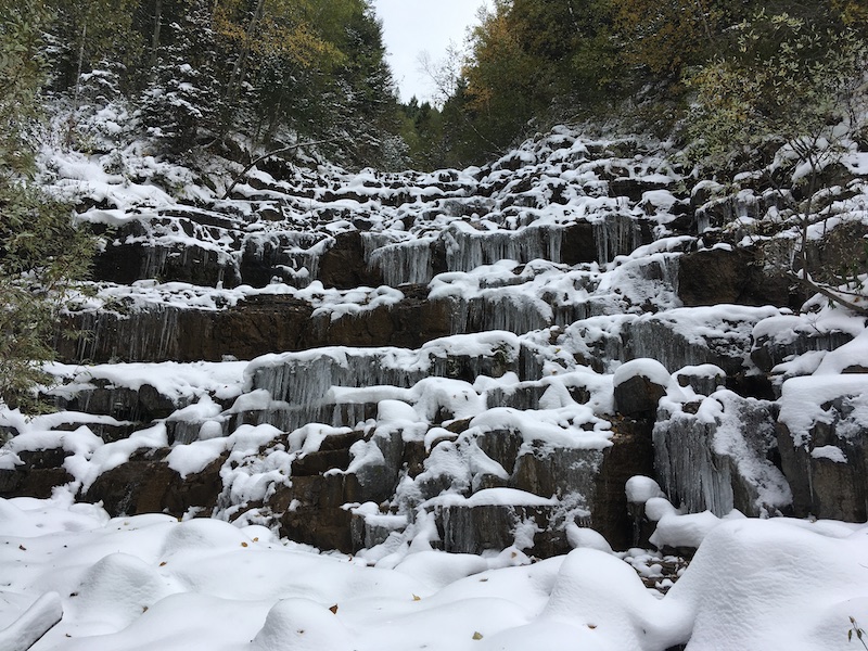 September 30, 2019 a very early snowstorm. Cold enough that the Silver Staircase Falls were frozen.