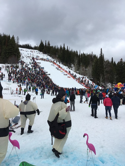 April 6, 2019, the Pond Skim competition at Whitefish Mountain. Ski down and across a pond of water. The first time is easy; the second time is off a jump; the third time is backwards; and then it gets hard!
