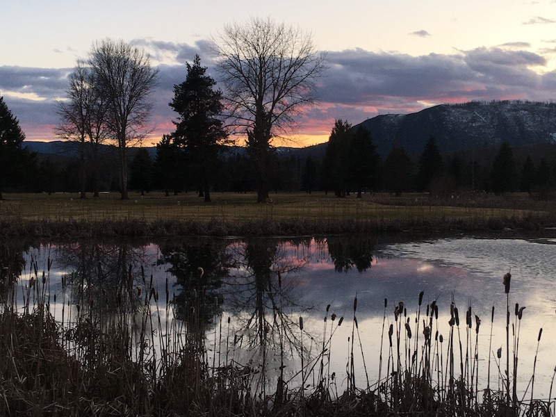 Looking west across the golf course, a small bit of ice remains on the pond with the clouds on fire.
