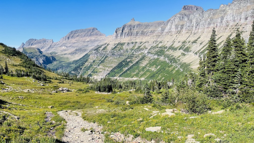 The Garden Wall. The distinctive Bishop's Cap peak in the middle with the Highline trail visible.