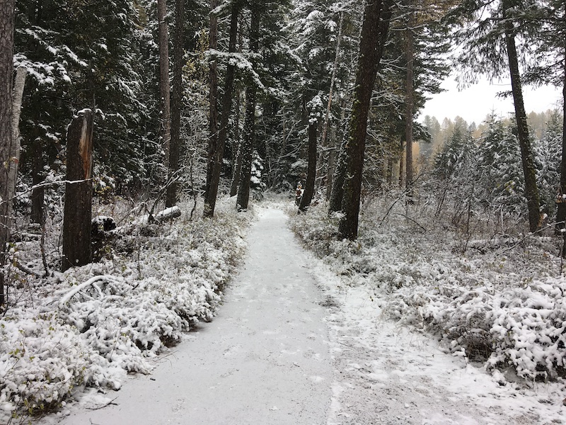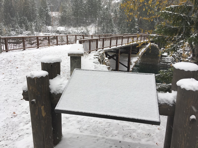 Very unusual weather this October. We've had 2 snowstorms already this month. Another large one is today -- light snow starting around noon continuing thru noon tomorrow. So at 1pm I head off for my standard maintenance run. 4 miles round trip to the old bridge, using the bike trail inside the park to make a loop. It's been snowing steadily as I head out.