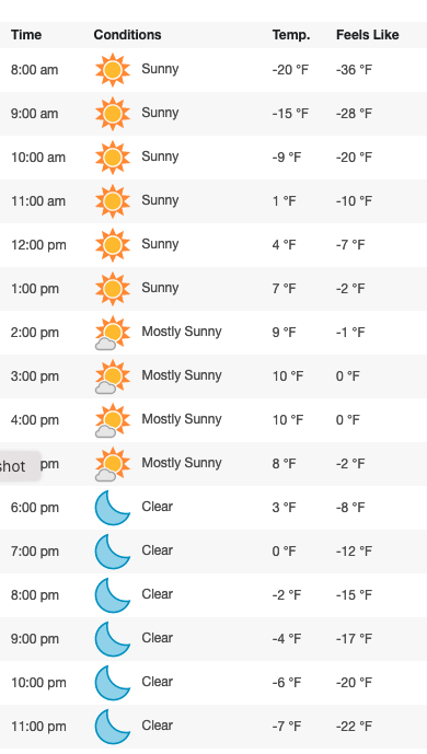 ***We have a 5:00 AM temperature at the Summit of -20 degrees, gusts up to 24mph and a wind chill of -45. We will only be running lower mountain lifts today (Chairs 2, 3, 6, 9 and the Big Easy carpet). Night skiing tonight will be canceled as well.*** It's day 6 of cold temperatures and round two of the coldest. I think all you can do is laugh, cozy up at home, sharpen your edges and do that thing you needed to do... call your grandma? It's a great reminder that in the end, the mountains and mother nature are in charge of the show. For the LOWER mountain we have a forecasted */*high*/ of 6 degrees and wind chills temperatures as low as *-37*, with moderate winds and sunny skies. *For those that head out on the hill today, be sure to wear many insulating layers, keep all exposed skin covered, and keep in mind it's always a good idea to *ski and ride with a partner.*
