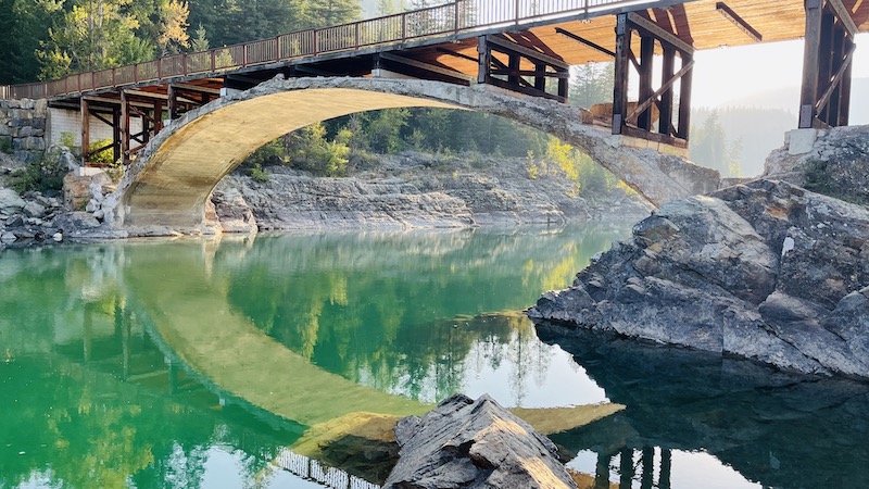 I discovered a few years ago while running that around Labor Day weekend at about half an hour after sunrise a magical natural light show can occur. It requires clear skies and very still water, and happens at the old bridge. As the sun rises to just the correct angle on the horizon, the reflection off the river illuminates the underside of both the wood portion of the bridge and also the arch .... which then reflects a second time off the water to present an oval appearance. It only lasts 10~15 minutes