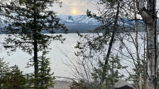 Westward view is where Snyder Creek flows in to the lake, with the sun setting over Howe Ridge, and the Apgar mountains further away on the left.