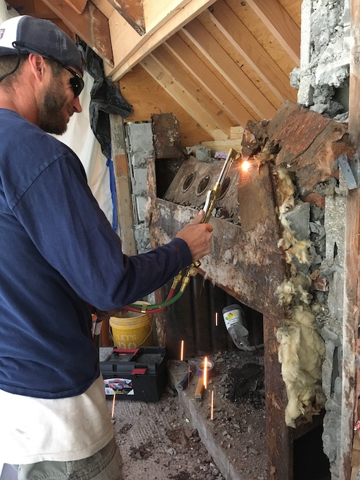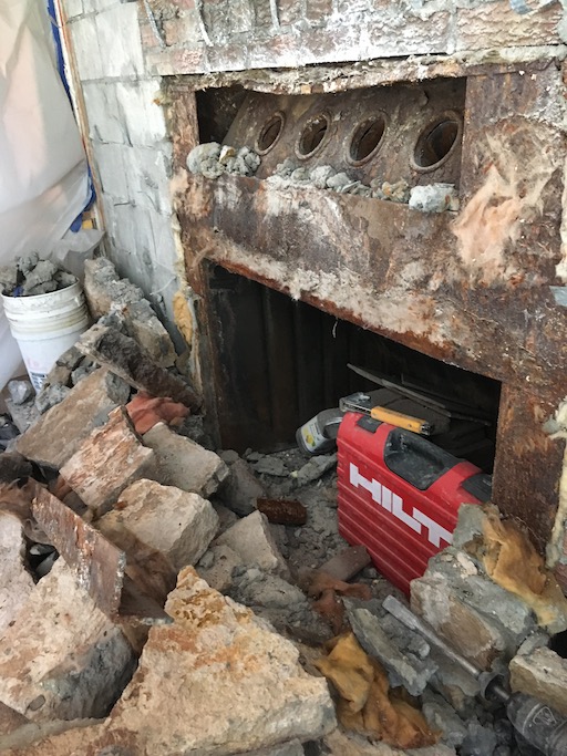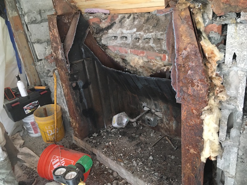 We previous had a propane "fireplace insert". An insert, as the name suggests, is designed to be /*inserted*/ into a fireplace opening with a chimney. So with no chimney anymore we needed to replace that with a "propane fireplace", which uses a much simpler exhaust system. In preparation for that, the metal firebox for the original wood burning fireplace must be removed due to size constraints.