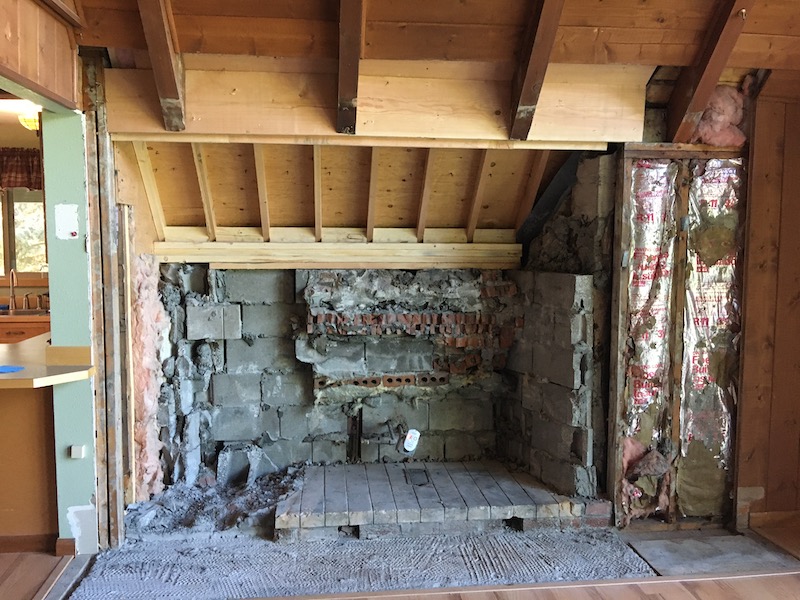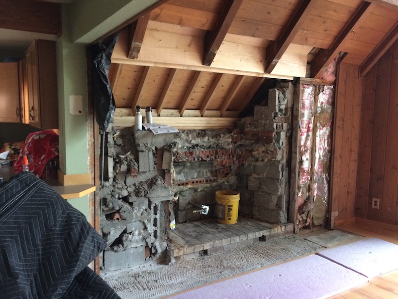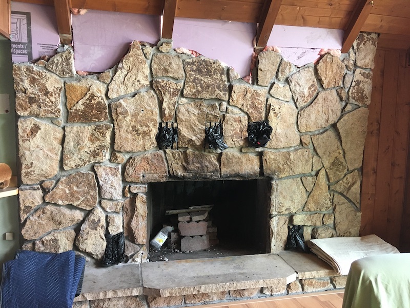 And on completion of the demolition, we end up with this cavity. Since this was not planned in advance, we now wait for our carpenter (who we worked with before) to free up to frame the area for the fireplace, cabinets and shelf. The propane fireplace is ordered and ready; the replacement stone is ordered and ready. Since the fireplace venting is simple and straightforward it can be done even in winter.