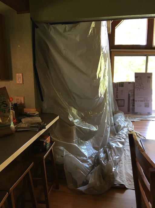 The stonework is removed, one rock at a time, using a portable jackhammer. This generates and incredible amount of dust, so the first step is to tent it up as much as possible. Furniture was all covered in sheets. Pictures all removed due to vibrations.
