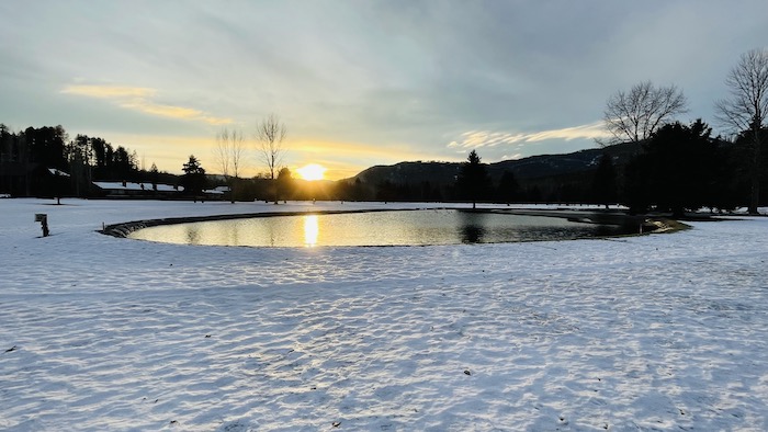 11/06/22. We had an early snow last November and I was able to ski around the golf course at sunset. It was even before the golf course ponds had a chance to freeze over.