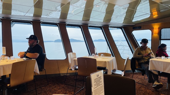 Unlike Amtrak, meals are not included as part of the sleeping accommodation. We had a large cooler with fixings for breakfast and lunch, but did have dinners in the restaurant. That was the only place on the ferry one could purchase beer or wine. There were crossed out signs onboard that pointed to a cocktail lounge which must no longer exist. I had brought enough Cold Smoke in the cooler in the cabin to see me thru the trip.