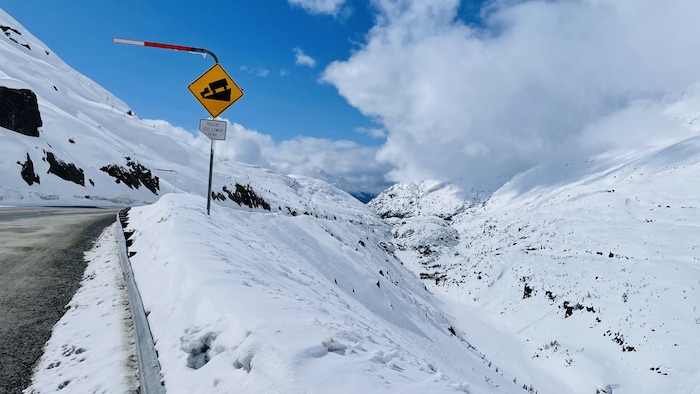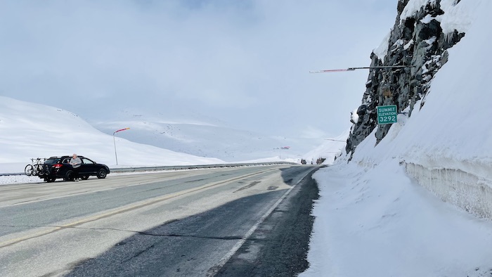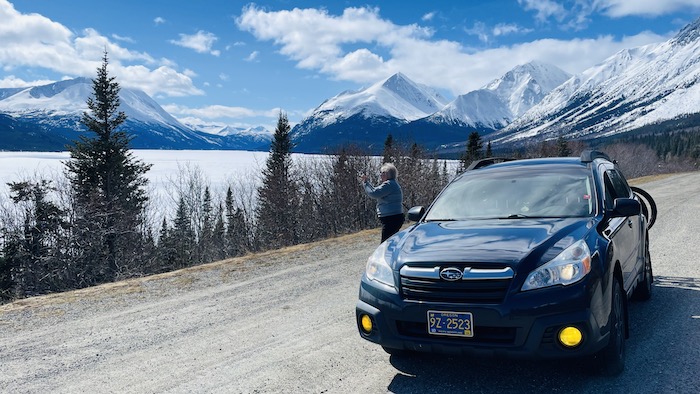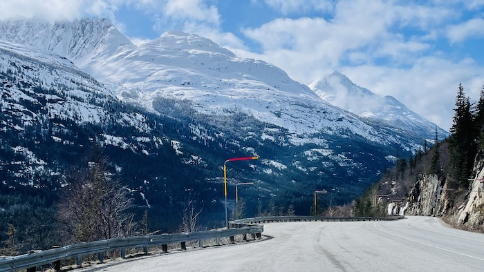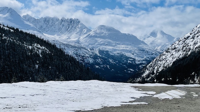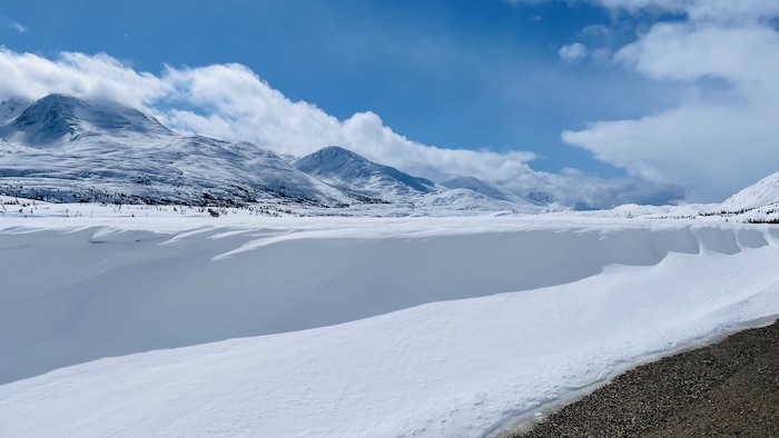 After one night in town, we are on the road. The first 10 miles head uphill to White Pass, which is the Canadian border. A very curious observation about timezones on this day's drive. All of Alaska is on one timezone, including Skagway. In April with daylights savings, it is on ADT. As we cross the border in to Canada, we enter British Columbia which is on Pacific Daylight Time (PDT). About 40 miles further on the road we cross in to the Yukon Territory, which is year round on Mountain Standard Time (MST). So within 2 hours of driving we passed thru 3 timezones!