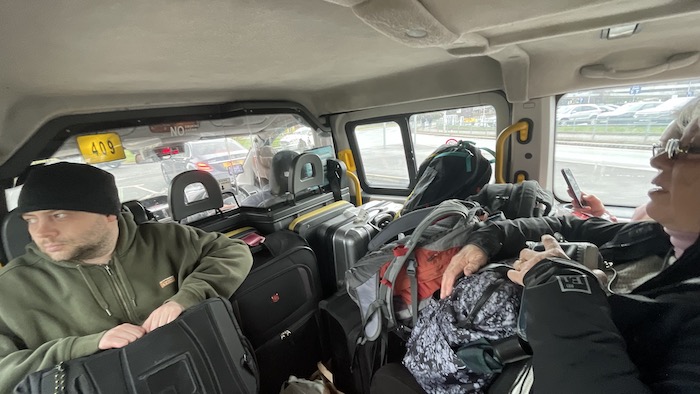 Our arrival at the train station in Manchester. Sandy and I and John and Nadine and way too much luggage all packed in to a standard British taxi cab