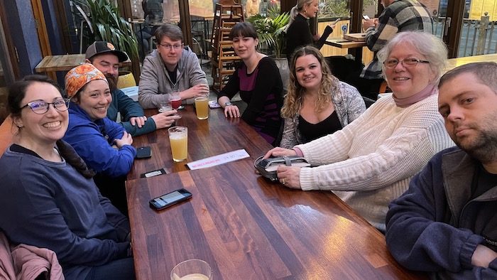Nadine, Sally, Bryson, Sam, Becka, Sarah, Sandy and John (and me!) out for pizza two days before the wedding. It was great to be able to get together at all during the hectic pre wedding days.